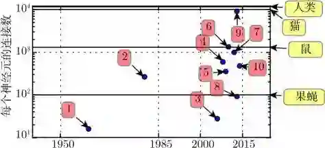图 1.10 与日俱增的每个神经元的连接数。最初,人工神经网络中神经元之间的连接数受限于硬件能力。而现在,神经元之间的连接数大多是出于设计考虑。一些人工神经网络中每个神经元的连接数与猫一样多,并且对于其他神经网络来说,每个神经元的连接数与较小哺乳动物 (如小鼠) 一样多,这种情况是非常普遍的。甚至人类大脑每个神经元的连接数也没有过高的数量。生物神经网络规模来自 Wikipedia (2015)
