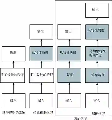 这种方法我们称之为表示学习。学习到的表示往往比手动设计的表示表现得更好。并且它们只需最少的人工干预,就能让AI系统迅速适应新的任务。表示学习算法只需几分钟就可以为简单的任务发现一个很好的特征集,对于复杂任务则需要几小时到几个月。手动为一个复杂的任务设计特征需要耗费大量的人工、时间和精力,甚至需要花费整个社群研究人员几十年的时间。
