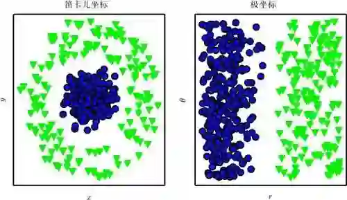 图 1.1 不同表示的例子:假设我们想在散点图中画一条线来分隔两类数据。在左图中,我们使用笛卡儿坐标表示数据,这个任务是不可能的。在右图中,我们用极坐标表示数据,可以用垂直线简单地解决这个任务 (与 David Warde-Farley 合作绘制此图)