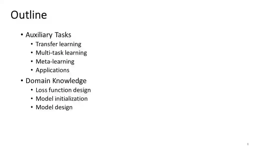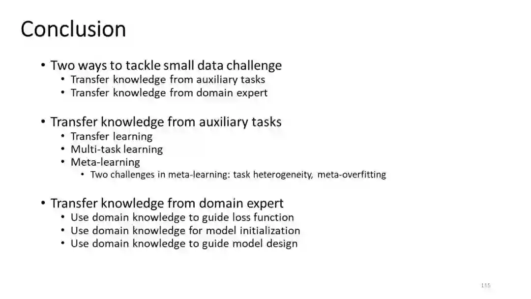 在大数据时代,数据驱动的方法在图像识别、交通信号控制、假新闻检测等各种应用中越来越受欢迎。这些数据驱动方法的优越性能依赖于大规模的标记训练数据,而实际应用中可能无法获得这些数据,即“小(标记)数据”挑战。例如,预测一个城市的突发事件,发现新出现的假新闻,以及预测罕见疾病的病情发展。在大多数情况下,人们最关心的是这些小数据案例,因此提高带有小标记数据的机器学习算法的学习效率一直是一个热门的研究课题。在本教程中,我们将回顾使用小数据进行学习的最新的机器学习技术。这些技术被组织从两个方面: (1) 提供一个全面的回顾最近的研究关于知识的泛化,迁移,和共享,其中迁移学习,多任务学习,元学习被讨论。特别是元学习,提高了模型的泛化能力,近年来已被证明是一种有效的方法; (2) 引入前沿技术,着重于将领域知识融入机器学习模型中。与基于模型的知识迁移技术不同,在现实应用中,领域知识(如物理定律)为我们提供了一个处理小数据挑战的新角度。具体地说,领域知识可以用来优化学习策略和/或指导模型设计。在数据挖掘领域,我们认为小数据学习是一个具有重要社会影响的热门话题,将吸引学术界和产业界的研究者和从业者。
