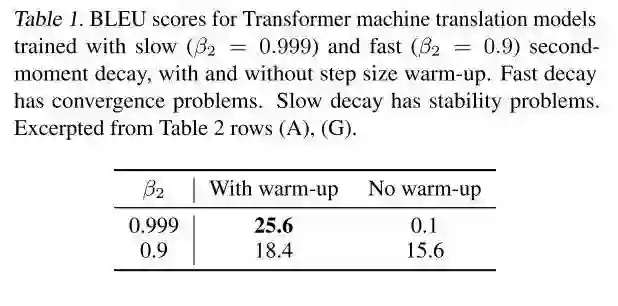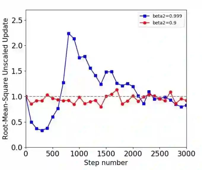 对于这一现象,作者是这样解释的:较慢的衰减速率意味着二阶矩估计是基于更早的梯度的原因。如果模型优化的很快,就会导致很高的估计误差,这就导致了参数更新时候产生的错误。本文中,作者使用了均方根值来检测模型的训练过程中是否出现了这个问题。