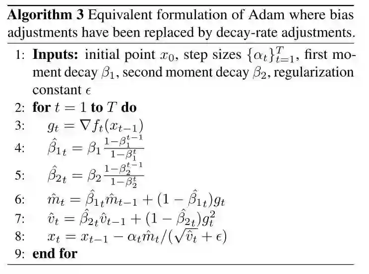使用该算法后,beta2 在 t=1 的时刻为 0,然后逐渐趋向于设定的 beta2 的值。除此之外作者还提出了其他的具体算法实现衰减的逐渐增加。