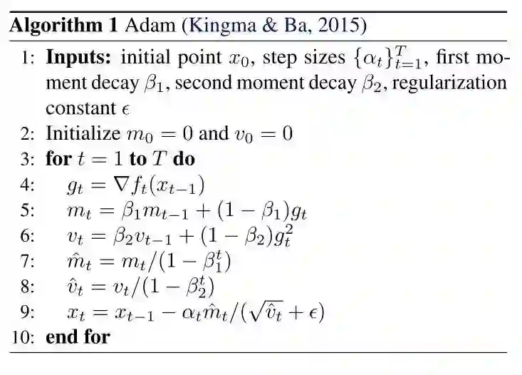 Adam 也是基于梯度下降的方法,但是每次迭代参数的学习步长都有一个确定的范围,不会因为很大的梯度导致很大的学习步长,参数的值比较稳定。下面是 Adam 算法的伪代码: