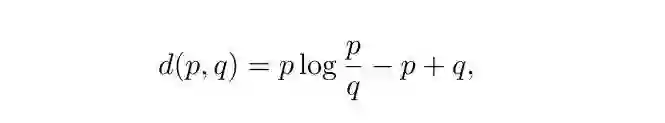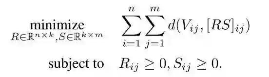 处理一个大型矩阵的时候,我们习惯使用低秩毕竟的方法替换这个大型的矩阵来解决一些运算上的问题。比如最广为人知的低秩逼近方法——奇异值分解 (SVD)。本文的作者为了寻求更合适的方法,从非负矩阵分解中寻找灵感。除了 F 范数外,另一种比较常用的代价函数是 K-L 散度,也被称为 I- 散度。对于非负的标量输入,I- 散度可以表示为下式: