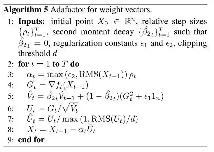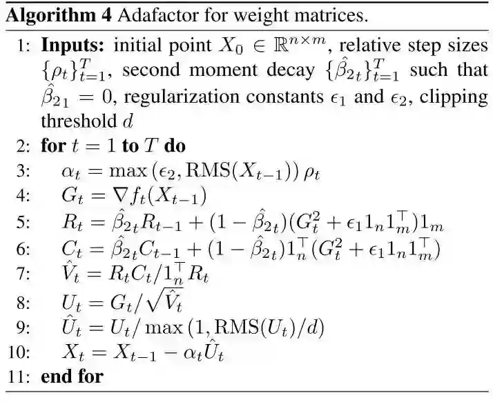 结合上述三条策略,完整的 Adafactor 算法如下所示,其中,算法 4 是针对矩阵形式的参数设计的优化算法,算法 5 则是为向量形式的参数所设计。值得一提的是 Adafactor 算法已经在最新的 TensorFlow 中开源,用户可以通过 TensorFlow 的 optimize 直接调用 Adafactor,源码地址: