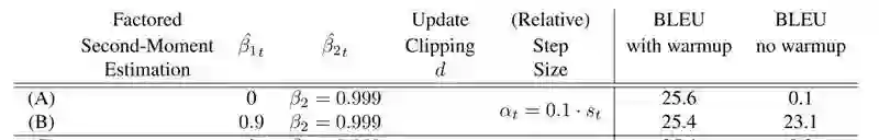 在 Adam 算法中,每个参数都需要两个额外的累计项。上面的算法对第二个累积项进行了分解,减少了其内存占用。为了移除第一个累积项,作者首先尝试了直接将 beta1 设置为 0。