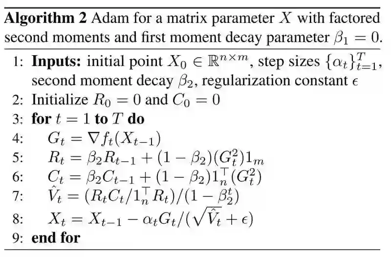 类似 Adafactor 的方法最早是由 Hinton 团队在论文 2017 年 ICLR 的论文”Outrageously large neural networks: The sparsely-gated mixture-of-experts layer”提出。在 2014 年,Gupta 团队使用嵌入向量的方法对 Adagrad 的累积项进行平均,同样实现了减少内存的使用。在性能相同的情况下,Adafactor 可以将内存的占用从 O(nm) 减小到 O(n+m)。