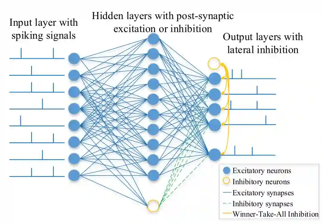 前面提到过SNN的网络结构与ANN类似,但是它们之间也有不同之处,这个不同就是源于生物神经网络中神经元的侧向抑制作用。所谓侧向抑制,就是指处于同一层中的不同神经元之间的相互作用。当一个神经元接受刺激被激活以后,它除了将刺激传递到下一层神经元,还会因为本身被激活而抑制其同一层内周边神经元被激活的概率。从神经元模型中体现的就是膜电位高于静息电位(-65mV或者是其他预设值)的神经元会抑制其周围甚至同层内所有神经元的膜电位增长。这种侧向抑制作用使得受到刺激较多的神经元比其他神经元有更大概率产生脉冲信号输出,从ANN的角度来看,这有点类似于Attention机制,但是又比Attention机制更加强烈和粗暴。
