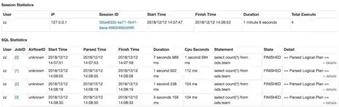 SparkSQL 需要收集 STS 上执行的 SQL 的审计信息,包括提交者执行的具体 SQL,开始结束时间,执行完成状态。原生 STS 会把这些信息通过事件的方式 post 到事件总线,监听者角色 (HiveThriftServer2Listener) 在事件总线上注册,订阅消费事件,但是这个监听者只负责 Spark UI 的 JDBC Tab 上的展示,我们改造了 SparkListener 类,将 session 以及执行的 sql statement 级别的消息也放到了总线上,监听者可以在总线上注册,以便消费这些审计信息,并且增加了一些我们感兴趣的维度,如使用的 cpu 资源,归属的工作流 (airflowId)。同时,我们增加了一种新的完成状态 cancelled,以方便区分是用户主动取消的任务。