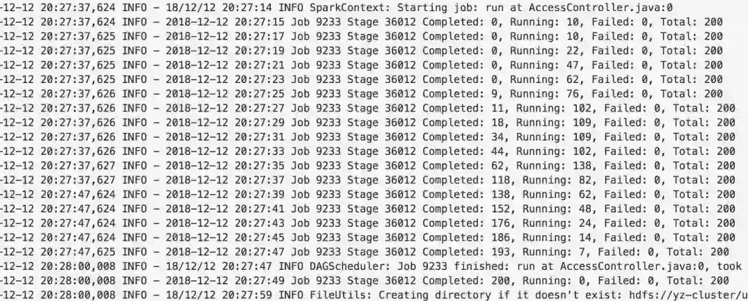 我们碰到的第一个问题是用户向我们抱怨通过 JDBC 的方式和 Spark thrift server(STS) 交互,执行一个 SQL 时,没有执行的进度信息,需要一直等待执行成功,或者任务出错时接收任务报错邮件得知执行完。于是执行进度让用户可感知是一个必要的功能。我们做了 Spark 的改造,增加运行时的 operation 日志,并且向社区提交了 patch(spark-22496), 而在我们内部,更增加了执行进度日志,每隔 2 秒打印出当前执行的 job/stage 的进度,如下图所示。