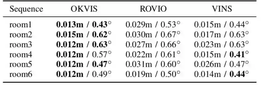 OKVIS和VINS-Mono整体上表现较好,但在某些较长的室外序列上表现不佳。ROVIO在某些序列上表现的更易于飘移和不收敛,这可以理解,因为它的后端基于卡尔曼滤波器,而OKVIS和VINS-Mono是采用计算复杂度更高的非线性最小二乘优化的形式。VINS-Mono在一些室外序列中会发散,但通常只会发生在相机回到运动捕捉房间之后或者从主要向前运动切换到快速旋转时。这也许是因为加速度偏移(bias)估计值的漂移(drift)造成的。