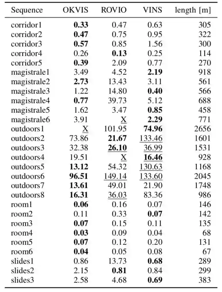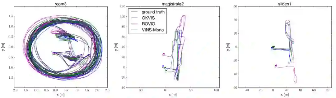 评估过程说明即便是当前最优的算法在长序列(magistrale,outdoors)和有视觉挑战性的序列(slides)上会有较大的漂移。这充分说明了该数据集足够有挑战性,可以作为未来视觉惯性里程计算法研究的基准。