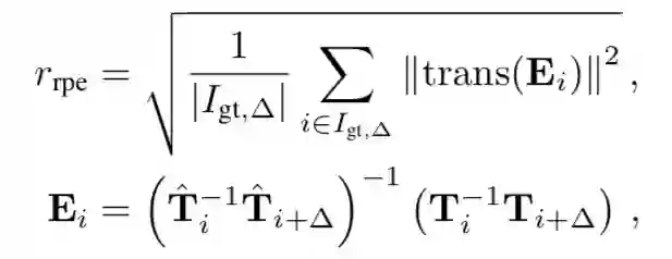 对于没有全局优化的视觉里程计而言,另外一种合理的定量标准就是相对位姿误差,具体定义如下: