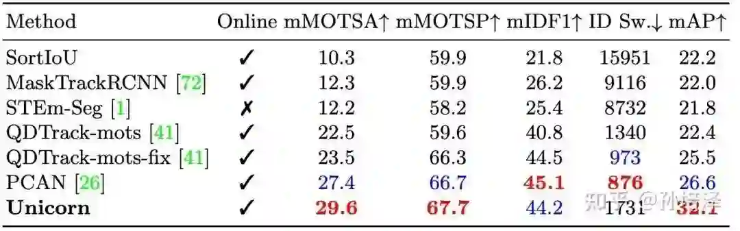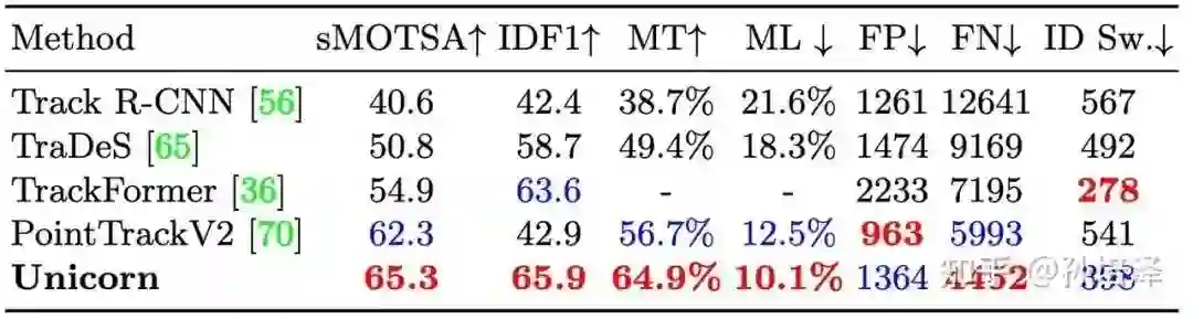 在MOTS Challenge数据集上,Unicorn在sMOTSA和IDF1两项重要跟踪指标上大幅领先于之前的方法,例如PointTrackV2、TrackFormer等。