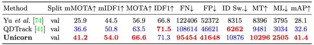 在BDD100K数据集上,Unicorn在mMOTA,mIDF1两项关键跟踪指标上均大幅领先之前效果最好的方法QDTrack,mMOTA和mIDF1两项指标分别有4.6%和3.2%的提升。