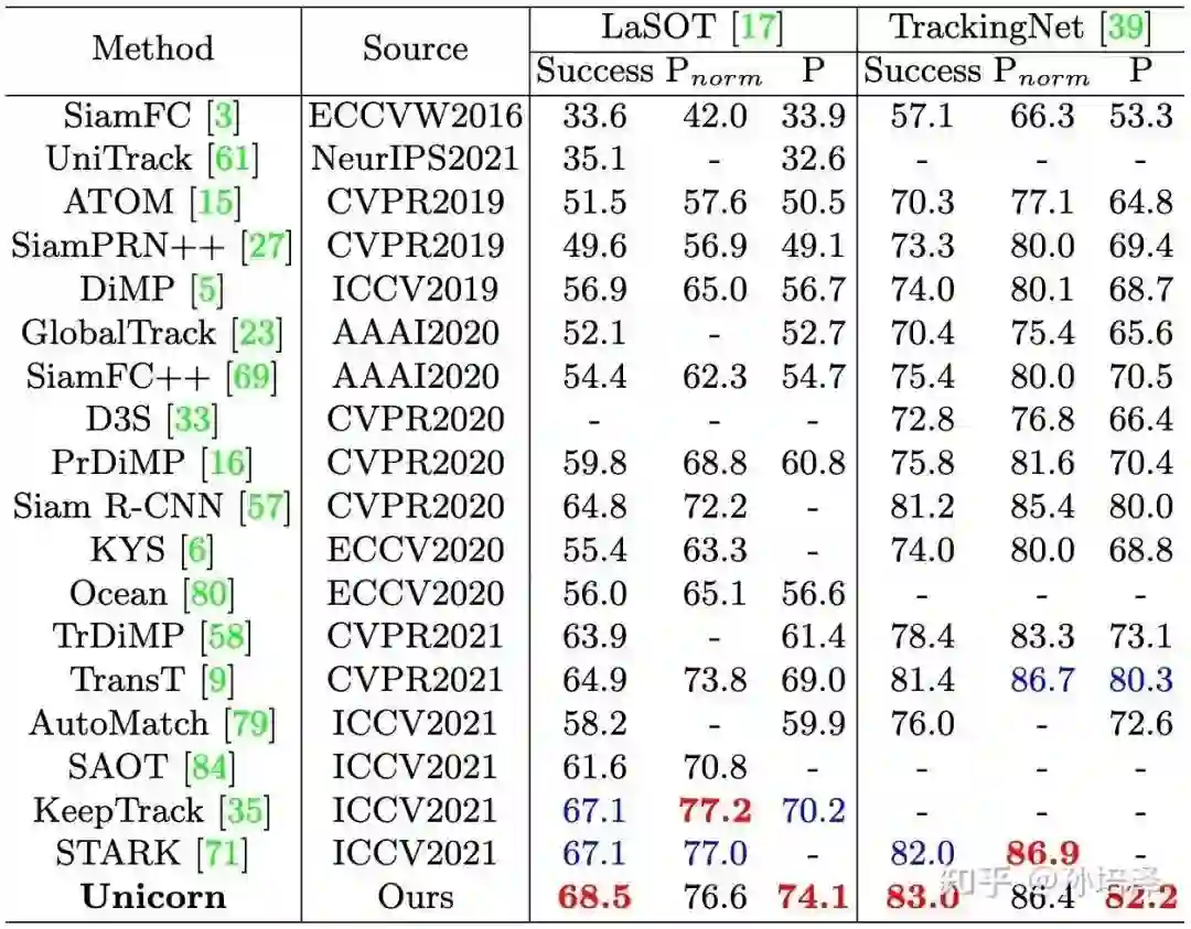 Unicorn在两个大规模SOT数据集LaSOT和TrackingNet上均做到了state-of-the-art,Success指标相比于之前最优的方法STARK分别提升了1.4%和1.0%。