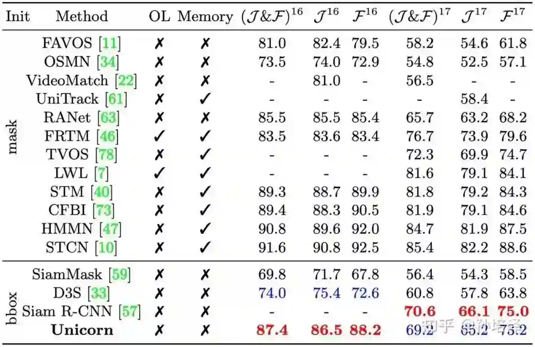 在DAVIS16和DAVIS17数据集上,第一帧无需精确的mask标注、仅使用box初始化,Unicorn仍取得了不错的成绩。在DAVIS16-17上,Unicorn相比于同样使用box初始化的SiamMask来说,J&F指标有17.6%和12.8%的提升!此外,尽管只利用box初始化,Unicorn的甚至也能和一些用mask初始化的方法(UniTrack,RANet等)相媲美。