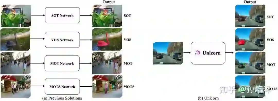 目标跟踪领域主要可分成以下四项子任务:单目标跟踪(SOT),视频目标分割(VOS),多目标跟踪(MOT),多目标跟踪与分割(MOTS)。由于不同子任务在定义与设定上的差异,绝大多数现有跟踪算法都是被设计用来解决单一或者部分子任务的,缺乏向其他任务的拓展能力。显然,他们的长期割裂状态对于跟踪领域的发展并不友好。