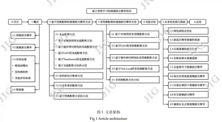 随着高分辨率显示设备的普及,传统的超分辨 率方法由于难以恢复视频和图像中的高频细节信息, 无法满足 4 倍放大因子的需求。而深度学习在图像、 语音、视频以及自然语言等领域取得的巨大成功, 为超分辨率算法研究提供了新的思路。基于深度学 习的超分辨率算法展现出了强大的非线性学习能力, 并使传统超分辨率技术逐渐被取代。文章结构如图 1 所示,基于深度学习的视频超 分辨率方法存在两大关键技术挑战,即相邻帧的配 准和多帧信息的融合重建。图像配准模块的选用与 否是已有方法的最大区别,因此本文从基于图像配 准的方法和非图像配准方法两个方面,全面综述近 年来视频超分辨率方法的现状。多帧信息的融合重 建方式则取决于网络结构,视频超分辨率网络的具 体分类可见图 2。在基于图像配准的方法方面,本文 将其分为基于光流的方法,基于卷积核估计的方法 和基于可变形卷积的方法三类。并进一步对基于光 流的方法细粒度划分为基于常规卷积的光流配准方 法、基于 GAN 的光流配准方法、基于循环神经网络 的光流配准方法和基于 Transformer 的光流配准方 法四种。在非图像配准的视频超分辨率方法方面, 本文将其分为基于 3D 卷积的非图像配准方法、基 于 GAN 的非图像配准方法、基于循环神经网络的方 法和基于 Non-local 的非图像配准方法等四种方法, 并对它们分别进行介绍。