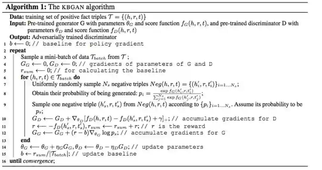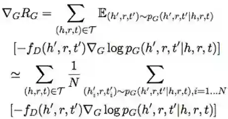 由于 R_G 是一个离散采样步骤得不到梯度,本文借鉴了其他论文提到的梯度策略理论获取梯度进行优化【这一部分论文把这个过程对标到强化学习,认为生成器是agent,判别器是environment, (h, r, t) 是 state,负样本概率分布 P_G 是policy,(h’, r, t’)是action,-f_D(h’, r, t’)是reward,认为是 one-step RL 是在每个 epoch,actions 不会影响 state,但每个 action 后会重新从一个不相关的state开始;为减小算法方差而不引入新参数,作者从 reward 减掉一个常量】