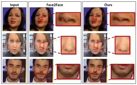 上图展示了我们的成果。通过拉近特写镜头,可以发现比起Face2Face,我们改进自动编码器后生成的图片能显示更多细节。Face2Face在鼻孔、鼻子、下巴和脸颊周围会生成大量伪影,我们的方法不仅让这些区域的线条更清晰,还修改了人脸3D模型与背景之间的过渡错误。同时,它还改进了Face2Face由于照明参数估计错误导致的伪影问题。