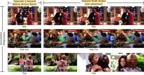 MIT的CSAIL实验室也放出了一篇博客,题目是《教会机器去预测未来》,该模型在youtube视频和电视剧上(例如The Office和《绝望主妇》)训练,训练好以后,如果你给该模型一个亲吻之前的图片,该模型能自动推测出加下来拥抱亲吻的动作,具体的例子见下图。 图17. 给出一张静态图,模型自动推测接下来的动作