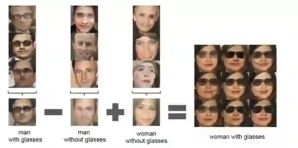 生成对抗网络的另一篇有影响力的论文是深度卷积生成对抗网络DCGAN,作者把卷积神经网络和生成对抗网络结合起来,作者指出该框架可以很好的学习事物的特征,论文在图像生成和图像操作上给出了很有意思的结果,例如图13,带眼睛的男人-不戴眼镜的男人+不带眼睛的女人=带眼睛的女人,该模型给出了图片的类似向量化操作。 图13. DCGAN论文中的例图