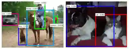 伴随着图像分类任务,还有另外一个更加有挑战的任务–图像检测,图像检测是指在分类图像的同时把物体用矩形框给圈起来。从14年到16年,先后涌现出R-CNN,Fast R-CNN, Faster R-CNN, YOLO, SSD等知名框架,其检测平均精度(mAP),在计算机视觉一个知名数据集上PASCAL VOC上的检测平均精度(mAP),也从R-CNN的53.3%,到Fast RCNN的68.4%,再到Faster R-CNN的75.9%,最新实验显示,Faster RCNN结合残差网(Resnet-101),其检测精度可以达到83.8%。深度学习检测速度也越来越快,从最初的RCNN模型,处理一张图片要用2秒多,到Faster RCNN的198毫秒/张,再到YOLO的155帧/秒(其缺陷是精度较低,只有52.7%),最后出来了精度和速度都较高的SSD,精度75.1%,速度23帧/秒。 图3. 图像检测示例