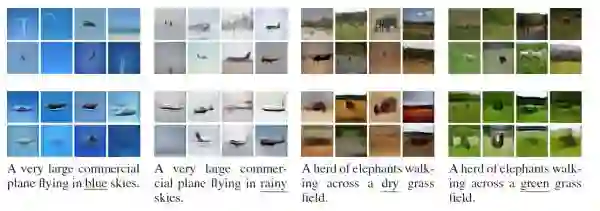 图片标注任务本来是一个半圆,既然我们可以从图片产生描述文字,那么我们也能从文字来生成图片。如图6所示,第一列“一架大客机在蓝天飞翔”,模型自动根据文字生成了16张图片,第三列比较有意思,“一群大象在干燥草地行走”(这个有点违背常识,因为大象一般在雨林,不会在干燥草地上行走),模型也相应的生成了对应图片,虽然生成的质量还不算太好,但也已经中规中矩。 图6.根据文字生成图片