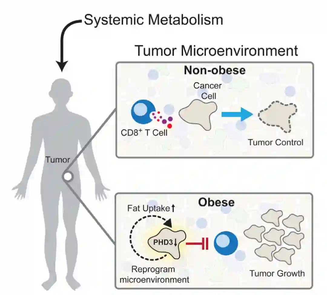 一直以来,肥胖被视为诱发癌症的主要危险因素,以往关于肥胖和癌症的研究主要集中在肿瘤内在效应或内分泌肿瘤细胞调节轴上,但机体代谢差异如何改变肿瘤微环境和影响抗肿瘤免疫尚不清楚。