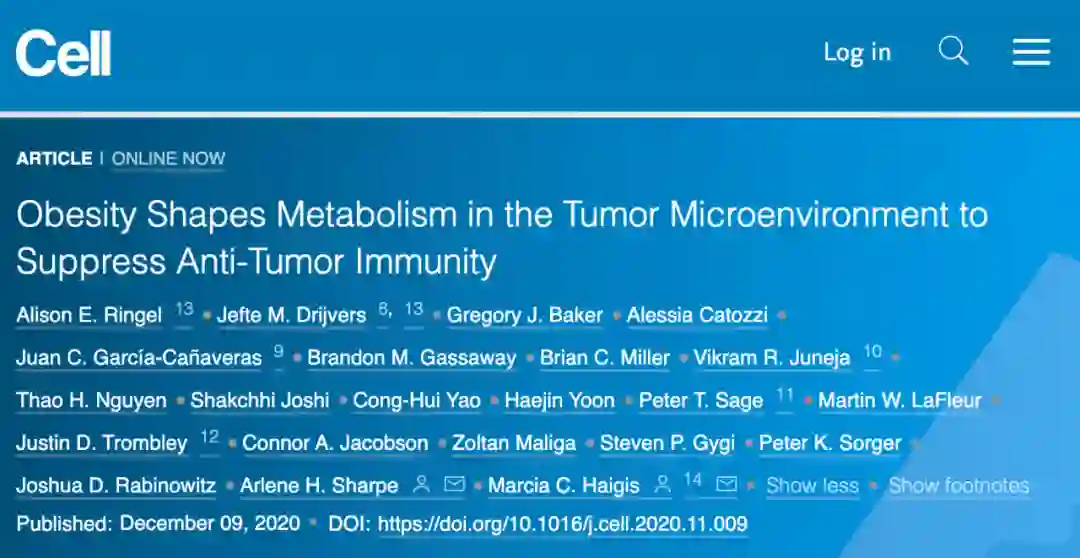 相关论文以“Obesity Shapes Metabolism in the Tumor Microenvironment to Suppress Anti-Tumor Immunity”为题,在线发表在科学期刊《细胞》(Cell)上。
