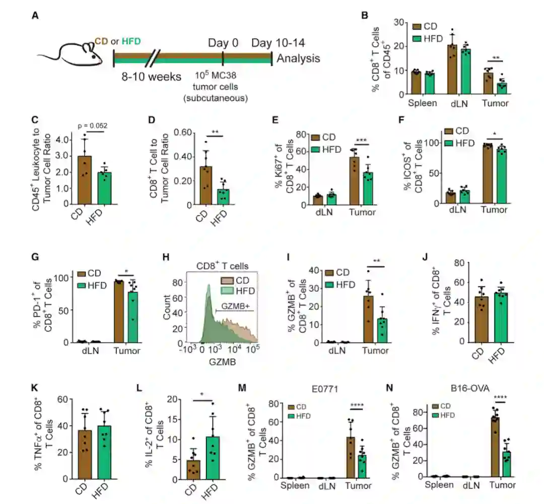 图|高脂肪饮食抑制了肿瘤内 CD8+ T 细胞的增殖和活性。A. 实验设置示意图,小鼠结肠癌模型 MC38;B-L. 流式细胞术分析(用于对悬浮于流体中的微小颗粒进行计数和分选)分析结果;M、N. 量化肿瘤中 CD8+ 肿瘤浸润淋巴细胞(CD8+ TILs)的 GZMB 表达。(来源:Cell)
