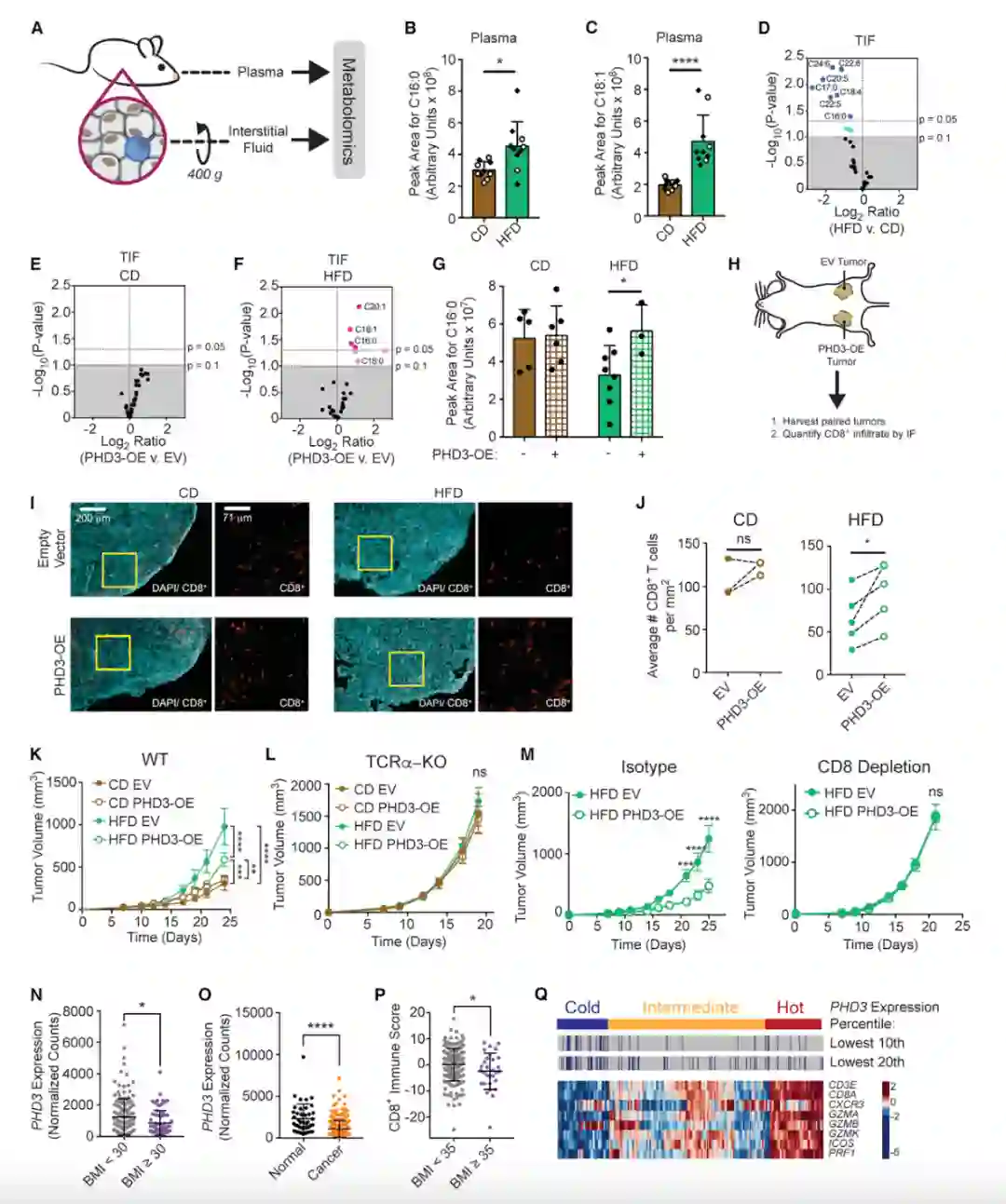 PHD3 表达的增加在很大程度上逆转了高脂饮食对肿瘤免疫细胞功能的负面影响。与 PHD3 低表达的肿瘤相比,PHD3 高表达的肿瘤在肥胖小鼠中生长较慢。