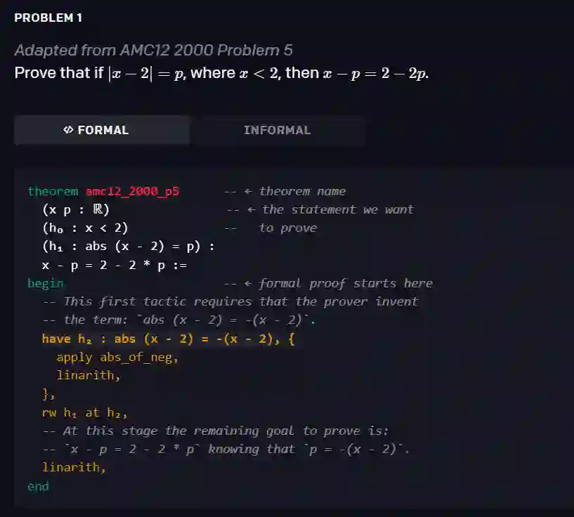 形式化数学(formal mathematics)是一个令人兴奋的研究领域,因为:1)它很丰富,可以让你证明需要推理、创造力和洞察力的任意定理;2)它与游戏相似,也有一种自动化的方法来确定一个证明是否成立(即由形式系统验证)。如下图中的例子所示,证明一个形式化的命题需要生成一系列的证明步骤,每个证明步骤都包含对策略( tactic)的调用。