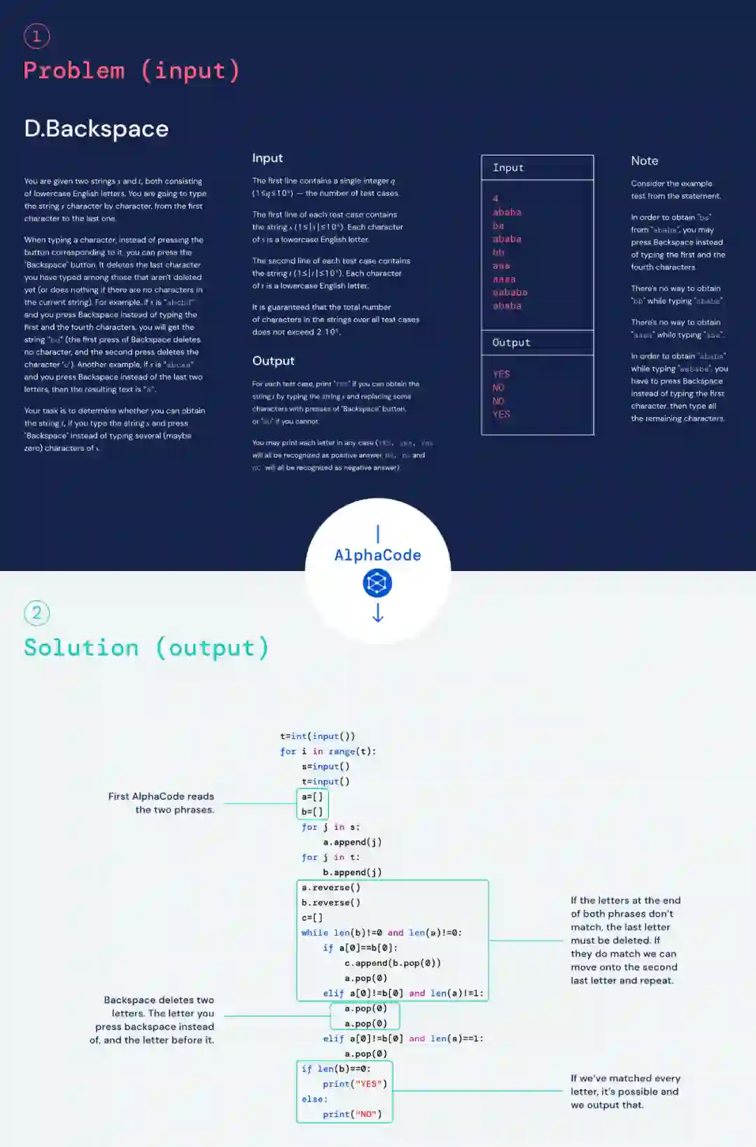 举个例子,在测试 AlphaCode 的一项挑战中,试题要求参赛者找到一种方法,使用一组有限的输入将一个随机、重复的 s 和 t 字母字符串转换为另一个相同字母的字符串。例如,竞争对手不能只输入新字母,而必须使用「backspace」命令删除原始字符串中的几个字母。对于 AlphaCode 来说,这只是中等难度的挑战: