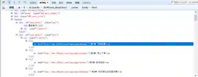 这样我们可以看到,每一章的链接地址都是有规则地存放在<li>中。而这些<li>又放在<div id=”book_detail” class=”box1″>中。