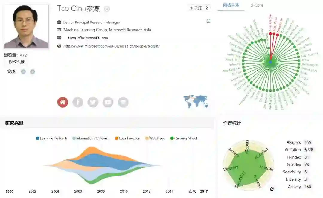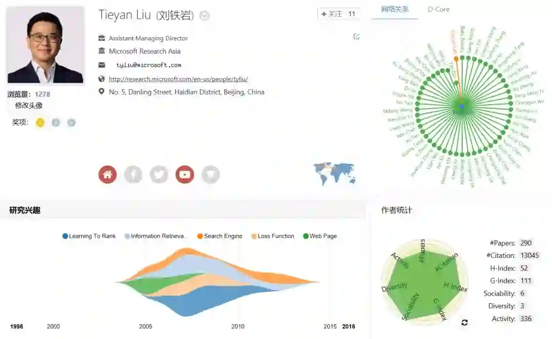 刘铁岩博士的先锋性工作促进了机器学习与信息检索之间的深度融合,被国际学术界公认为“排序学习”领域的代表人物,在网络搜索和计算广告学等方向取得了卓越的学术成果。他在该领域的学术论文已被引用万余次。他在深度学习、增强学习、分布式机器学习等方面也颇有建树,发表了百余篇学术论文。