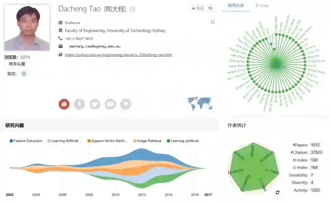 在华人作者中,位居高产作者榜首的是悉尼大学的陶大程教授,他共有8篇论文入选。昨日他刚刚入选2019年ACM Fellow。他的H-index值高达100。