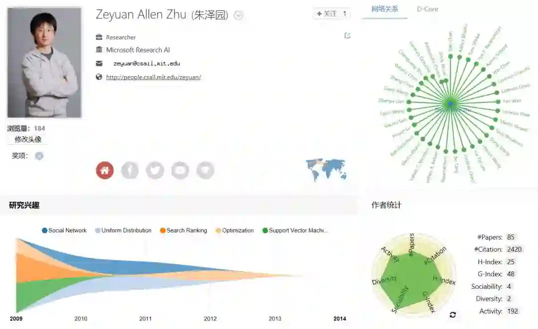朱泽园以一作身份发表4篇论文。他目前就职于微软总部研究院。清华毕业后他在MIT读完了硕士和博士,做了两年博士后之后去年进入微软,成为 Redmond 机器学习和优化研究组的成员。他致力于机器学习和优化的数学基础研究,并将其应用于深度学习、理论计算机科学、运筹学和统计学。