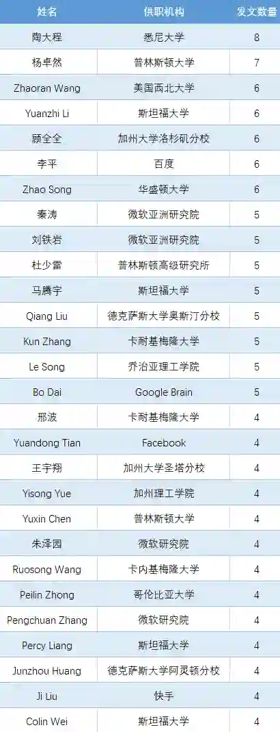 当然还有很多华人学者在此次NeurIPS上也有不错的表现,鉴于篇数有限,就不一一赘述,入选4篇以上的华人作者可见下表。