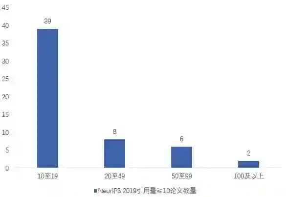 NeurIPS 2019论文中,引用量10以上的论文大约有55篇。其中,50以下引用量的论文数为47篇,50以上为8篇。具体而言,引用量在10到20之间的论文数为39篇,20至50的论文数为8篇;50至100的论文数为6篇,100以上的论文数为2篇。