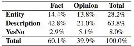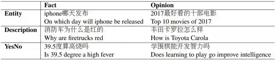 从百度某天的搜索日志里,取样出1000个问题进行分析。从两个视角对问题进行标注,(1)答案类别,包括Entity,Description和YesNo。Entity问题的答案可以是单个实体或者实体列表;Description问题的答案一般为多个句子的摘要,这类问题包括how/why类型也包括比较两个对象的优缺点;YesNo问题的答案一般为肯定或者否定的回答。(2)答案的主观特性,包括Fact和Opinion。问题类别举例如下表,从百度某天的搜索日志里,取样出1000个问题进行分析。从两个视角对问题进行标注,(1)答案类别,包括Entity,Description和YesNo。Entity问题的答案可以是单个实体或者实体列表;Description问题的答案一般为多个句子的摘要,这类问题包括how/why类型也包括比较两个对象的优缺点;YesNo问题的答案一般为肯定或者否定的回答。(2)答案的主观特性,包括Fact和Opinion。问题类别举例如下表,