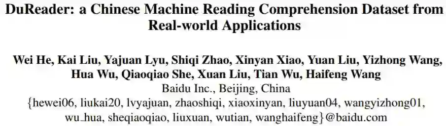 本文面向真实搜索场景的机器阅读问题,构造了一个大规模、开放领域的机器阅读数据集 DuReader。区别于之前的数据集,DuReader有以下几个特点:(1)问题来自于真实搜索场景,答案是用户生成的;(2)有丰富的问题类别;(3)为每个问题提供多个答案。第一版DuReader数据包括200k问题,1000k文档和420k答案,是目前为止最大的中文机器阅读数据。同时本文使用match-LSTM和BiDAF模型来进一步测试和分析数据的特性,实验表明DuReader是一个非常具有挑战性的数据指的进一步的研究。是一个非常具有挑战性的数据指的进一步的研究。是一个非常具有挑战性的数据指的进一步的研究。