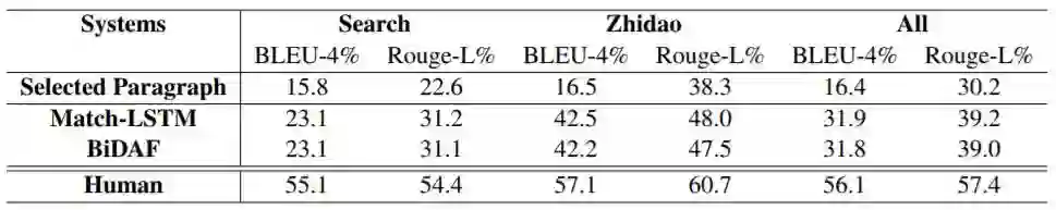 实验的基准方法直接使用Recall最高的段落作为答案。实验结果表明,现有的机器阅读模型相对比基准实验有了很高的提升,但是相比人类的水准依然差距很大。模型在Zhidao上的表现要好于Search,这说明了基于互联网开放领域的问答是一个难度更大的场景。