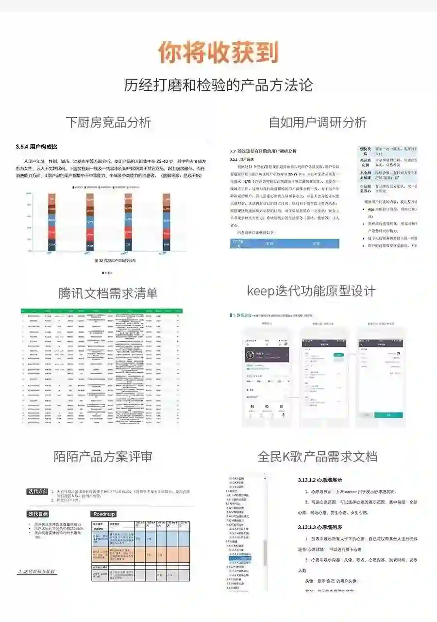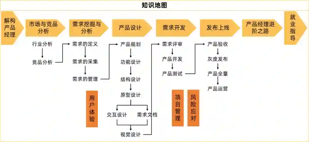 从行业分析-竞品分析-需求挖掘与分析-产品设计-项目管理-产品运营,体系化地讲解整体知识结构,全方位覆盖产品知识,内容完整。