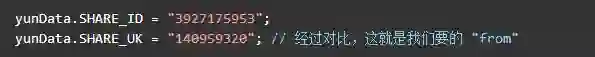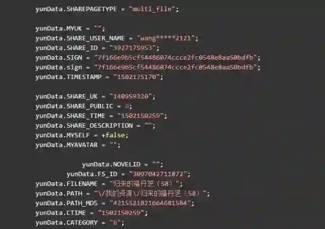 定位到4个shareid,前三个与该资源无关,是其他分享资源,最后一个定位到该 html 文件的最后一个标签块里。双击后可以看到格式化后的 js 代码,可以发现我们要的信息全都在里边。如下节选:
