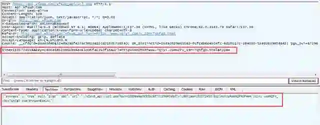 我们看到,第二条GET请求地址变了,并且在返回的信息中,我们看到,这个网页执行了一个POST请求。POST请求是啥呢?它跟GET请求正好相反,GET是从服务器获得数据,而POST请求是向服务器发送数据,服务器再根据POST请求的参数,返回相应的内容。这个POST请求有四个参数,分别为time、key、url、type。记住这个有用的信息,我们在抓包结果中,找一下这个请求,看看这个POST请求做了什么。