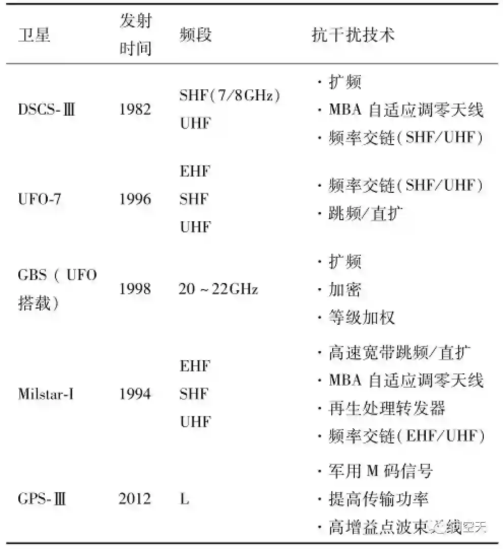 目前卫星微波抗干扰技术发展较快的是美国军用通信卫星的各种抗干扰技术,其导航卫星(GPS)抗干扰技术也在加紧研制中,典型的采用抗干扰措施的军用卫星有国防通信卫星DSCSⅢ、军事星Milstar和GPSⅢ等。