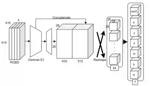 YOLOv3的变种,构建了一个轻量级的目标检测器,从RGBD-D立体摄像机输入深度和彩色图像。该模型的处理速度为44.35fps(GPU: NVIDIA RTX 2080 and CPU: Intel Core i7 8700K)。