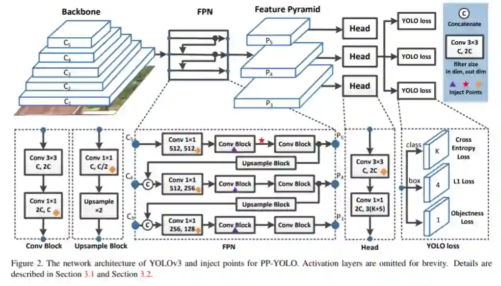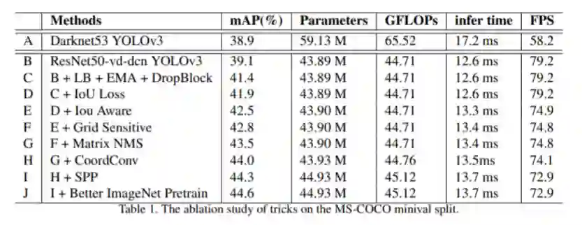 PP-YOLO由在YOLOv3上添加众多tricks“组合式创新”得来,从下图前两列中可看到其使用的技术: